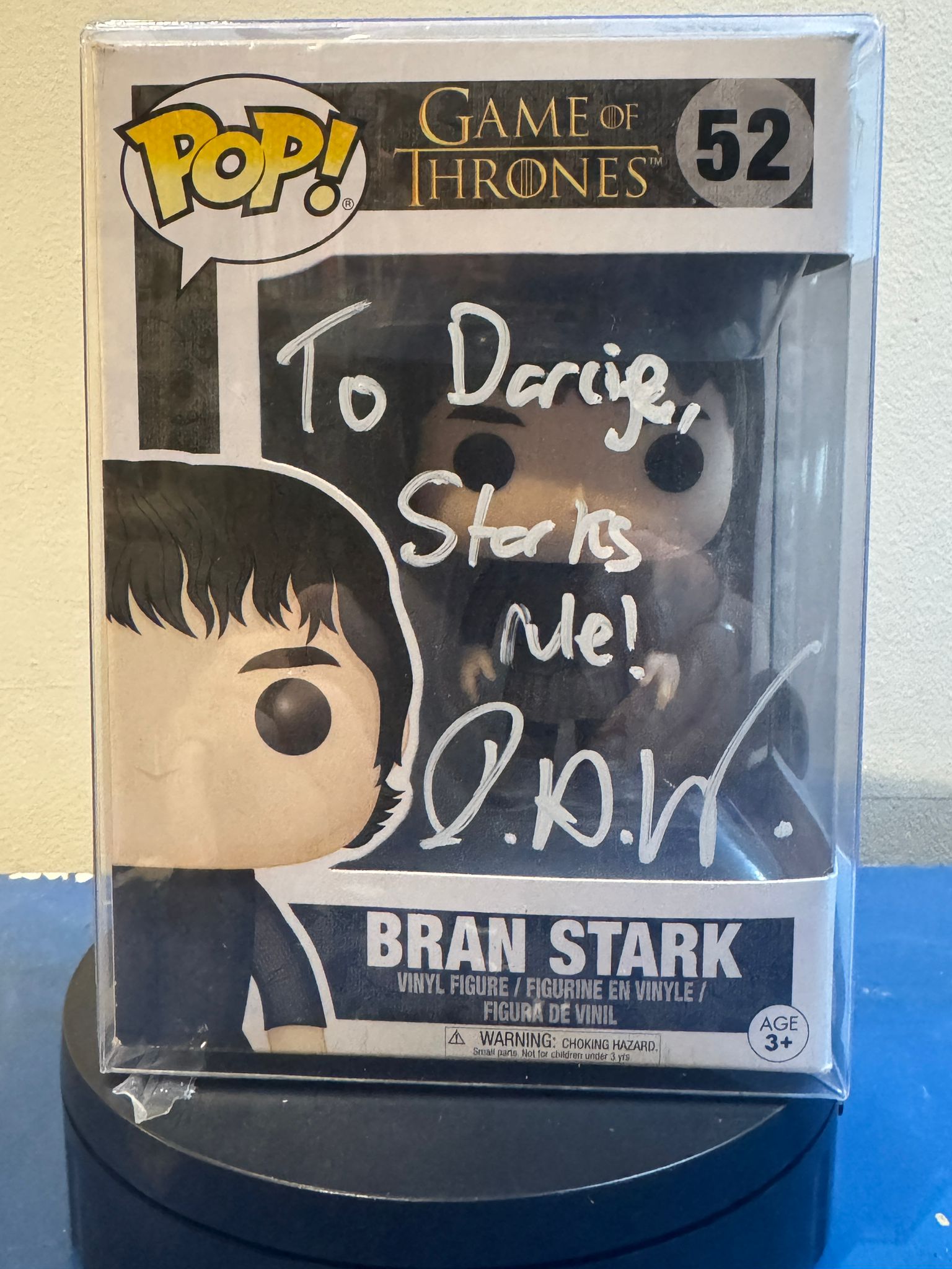 This is an original Bran Stark Funko Pop Vinyl figure, hand-signed by Isaac Hempstead Wright, who portrayed Bran Stark in Game of Thrones. The autograph is clean and well placed, making it a strong display piece for any fan or collector.